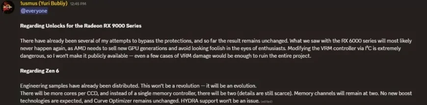 Ünlü hız aşırtma ve sistem optimizasyon yazılımı "Hydra"nın geliştiricisi Yuri Bubily, Zen 6 mühendislik örneklerinin şimdiden AMD'nin endüstri ortaklarına ulaştığını doğruladı. Bubily'nin paylaştığı bilgilere göre, en dikkat çekici yeniliklerden biri CCD (Core Complex Die) başına düşen çekirdek sayısındaki artış olacak.